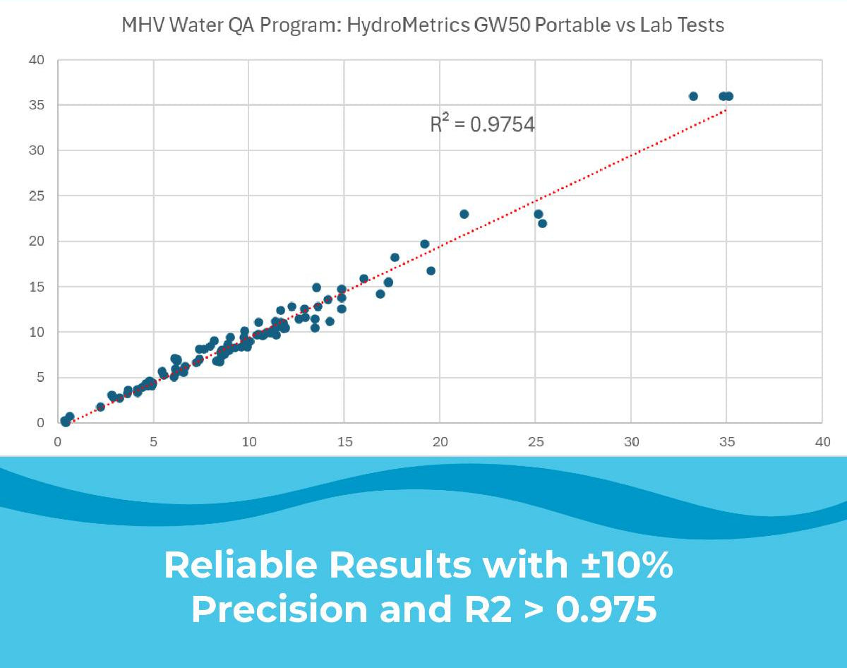 With an accuracy of +/- 5% or 0.3 mg (greater of) N/L (against standards). A recent customer analysis showed GW50™ field results were consistently within ±10% of lab results with an R2>0.975. The study demonstrates that the GW50™ delivers reliable, robust performance. This accuracy, combined with innovative engineering and flexible configurations, makes the HydroMetrics' solution a global leader.
